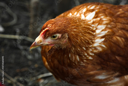 A young Loman Brown chicken is free-ranging in a closed area in search of a treat