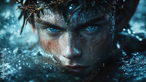 A young man with blue eyes and a crown of leaves emerges from the water, his gaze intense and focused.