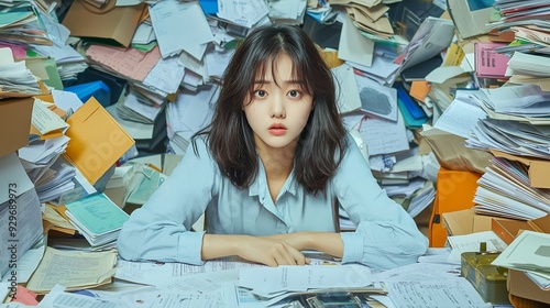 A young woman sits at a desk surrounded by a mountain of paperwork, looking stressed and overwhelmed.