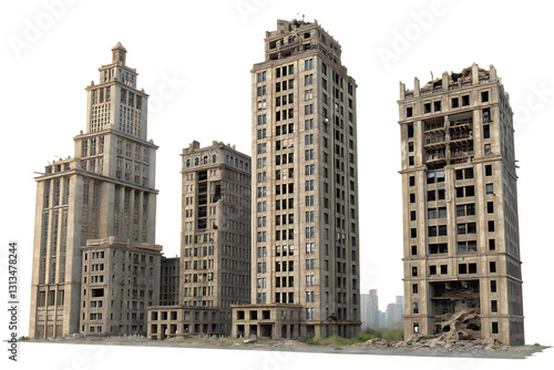 Abandoned and Ruined Skyscrapers - Isolated on White Background as Transparent. PNG. AI GENERATED