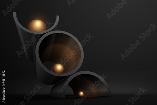 Abstract black geometric shapes with golden spheres