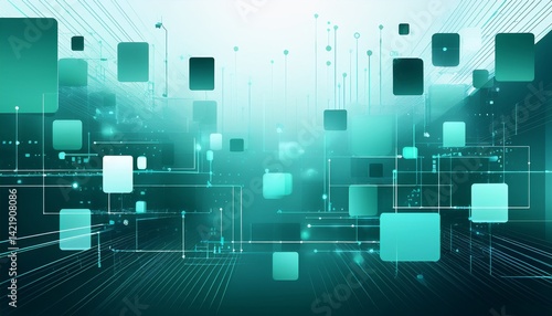 abstract composition features floating rectangles and fading dots in a turquoise gradient