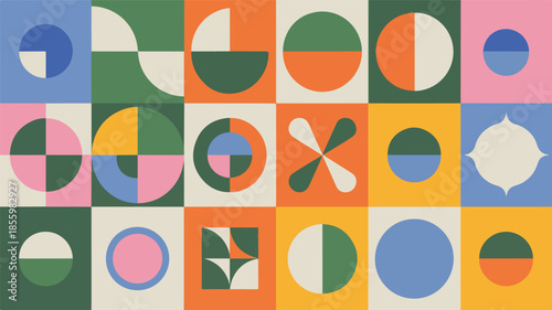 Abstract geometric composition with circles squares and arcs in pastel earthy tones shapes