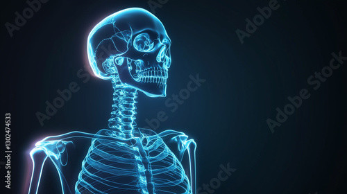 abstract glowing skeleton, x-ray skull, with a high-tech aesthetic, useful for educational materials, tech posters, and fantasy artwork