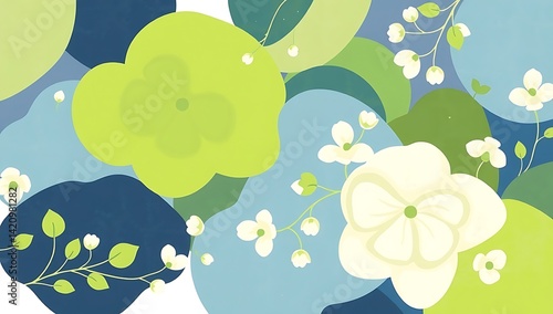 Abstract green and blue floral border, flowing organic shapes, gentle flower accents