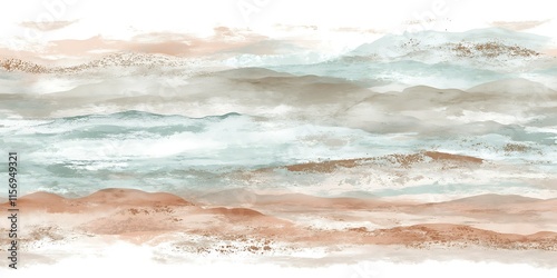 Abstract watercolor landscape painting with muted tones of peach, beige, and teal, depicting rolling hills and mountains.