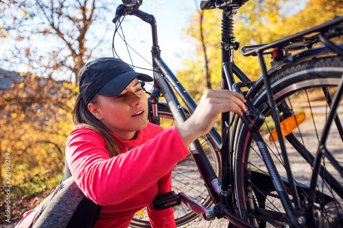 Active sport woman fixing a broken bicycle in the forest