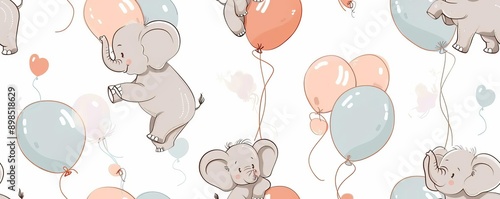 Adorable baby elephants with balloons, kid and baby style, seamless pattern background