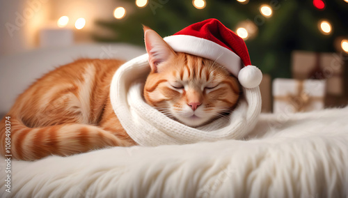 Adorable kitten in Santa hat with Christmas gift isolated on white background