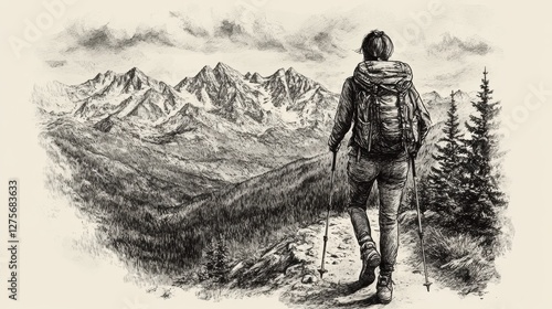 Adventurer Walking on Mountain Trail Surrounded by Scenic Peaks