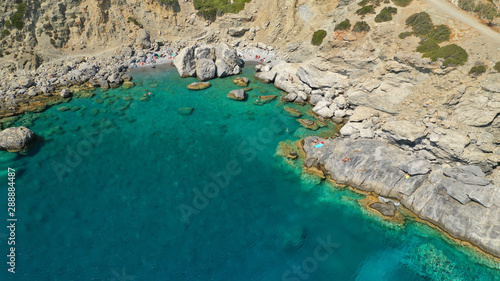 Aerial drone photo of iconic small chapel of Agia Anna built just above emerald rocky pebble beach, Amorgos island, Cyclades, Greece