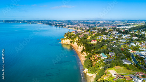 Aerial view of a beautiful suburb on the shore of a quiet harbour on a sunny morning. Auckland, New Zealand