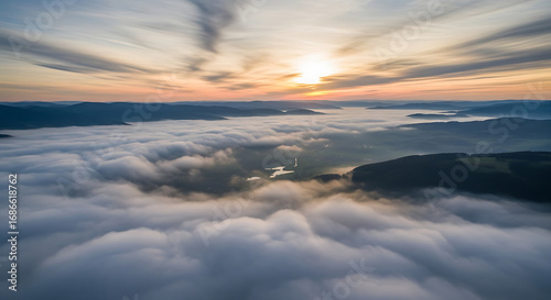 Aerial view of a landscape with mountains and a sea of clouds during a vibrant sunrise ai generated