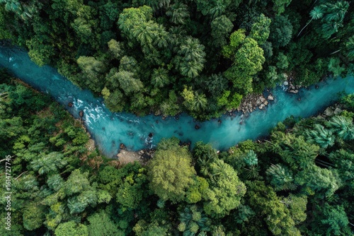 Aerial view of a turquoise river winding through a lush green rainforest