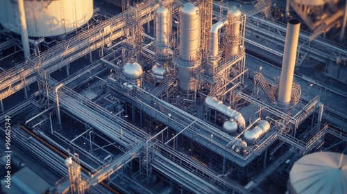 Aerial view of an industrial refinery complex with intricate pipelines, storage tanks, and tall structures under daylight.