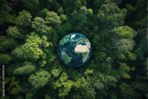 Aerial View of Earth Surrounded by Dense Green Forest Canopy, Vibrant Landscape From High Angle Perspective