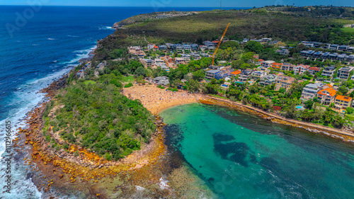 Aerial View of Manly Beach and Sydney harbour with manly houses on a warm summer day blue skies Sydney NSW Australia