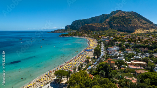 Aerial view of Mondello Beach, near Palermo, Sicily, Italy. It is a famous and beautiful tourist destination on the Mediterranean Sea. In background is Mount Pellegrino, overlooking the Tyrrhenian sea