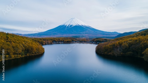 Aerial view of Mount Fuji framed by a serene lake and traditional Japanese buildings in the foreground
