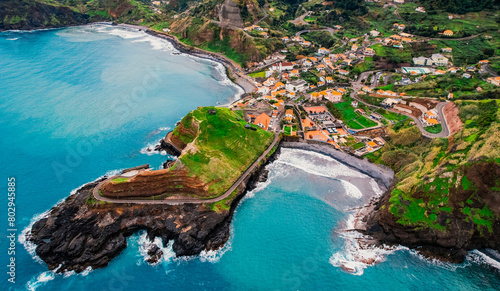 Aerial view of rough ocean with waves, volcanic beach in Porto da Cruz, Madeira, Portugal