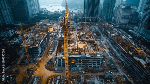 Aerial View of Urban Construction Site Cranes and Buildings
