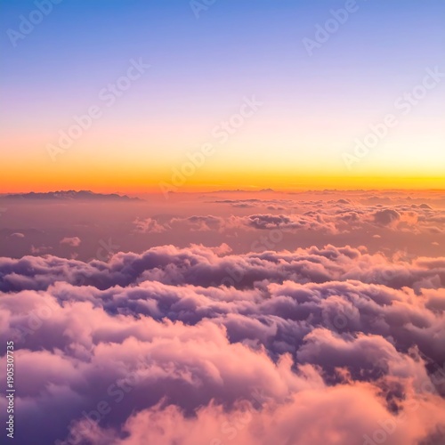 Aerial view of vibrant sunset illuminating fluffy clouds