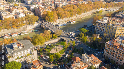 Aerial view over the Tiber River near Prati district in Rome, Italy. Autumn colors dye the trees along the river.