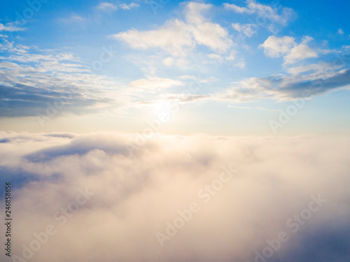 Aerial view White clouds in blue sky. Top view. View from drone. Aerial bird's eye view. Aerial top view cloudscape. Texture of clouds. View from above. Sunrise or sunset over clouds
