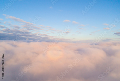 Aerial view White clouds in blue sky. Top view. View from drone. Aerial bird's eye view. Aerial top view cloudscape. Texture of clouds. View from above. Sunrise or sunset over clouds