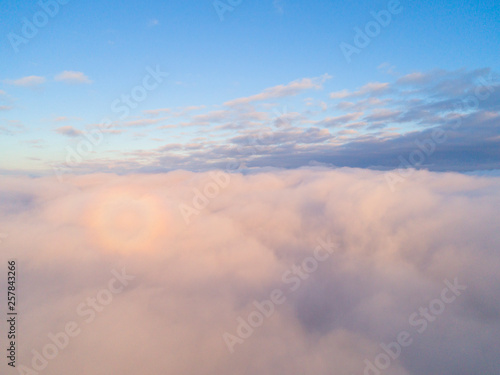Aerial view White clouds in blue sky. Top view. View from drone. Aerial bird's eye view. Aerial top view cloudscape. Texture of clouds. View from above. Sunrise or sunset over clouds