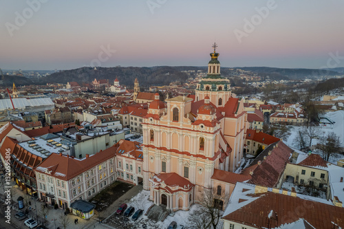 Aerial winter evening sunset view of Vilnius old town, Lithuania
