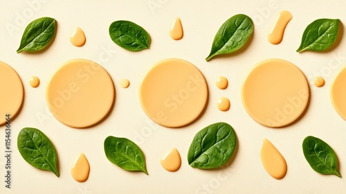 Aesthetic arrangement of yellow sauce circles and fresh spinach leaves on a soft beige background for culinary and food photography.