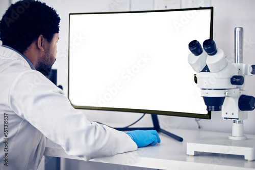 African scientist man, green screen and computer in research, reading or focus for goals in lab. Black man, science or laboratory with blank desktop pc for vision, healthcare or pharmaceutical mockup