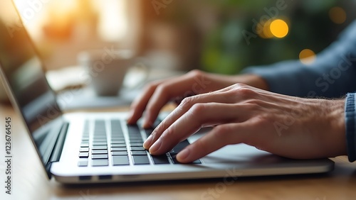 Against a blurred office scene, a close-up shot reveals a man's hands typing on a modern laptop keyboard