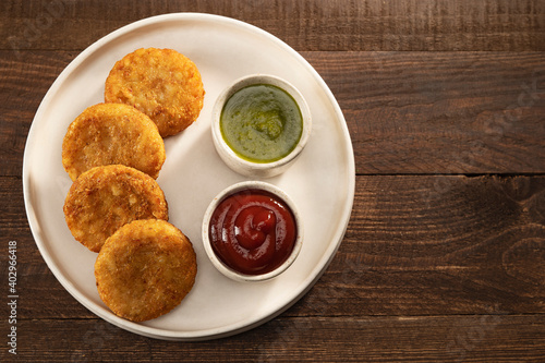 ALOO TIKKIS SERVED HOT WITH CHUTNEY AND SAUCE