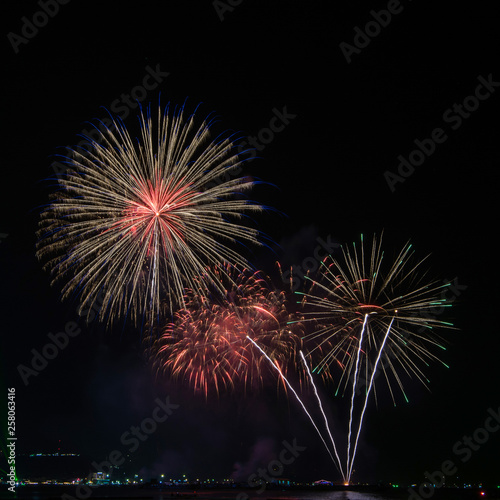 Amazing beautiful colorful fireworks display on celebration night, showing on the sea beach with multi color of reflection on water