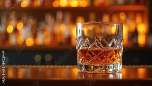 Amber Japanese whisky in crystal glass sits on polished bar counter. Soft bokeh lights create intimate high-end bar ambiance. Enjoying spirit.