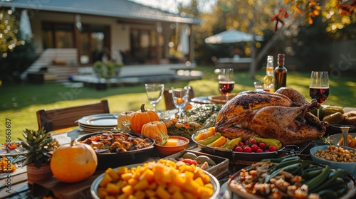 American, thanksgiving and dinner of turkey, food and vegetables on dining table outdoor. Usa, tradition and culture as celebration, express gratitude and reflect on blessings with meat on backyard