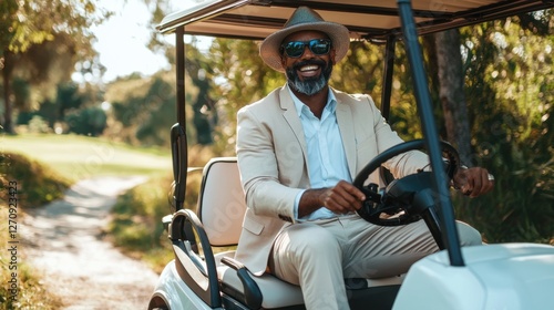 An adult in elegant clothes has fun one day on a golf course.The rich man is sitting in a golf cart. Advertising concept for golf.Copyspace for golf sports.