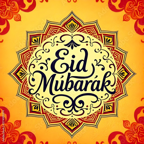 An artistic representation of 'Eid Mubarak' in bold, colorful letters, embellished with traditional lanterns, crescent moons, and stars, creating a warm and inviting atmosphere. No people in the scene