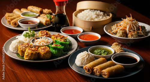 An assortment of asian cuisine dishes including dim sum spring rolls and rice on a wooden table top