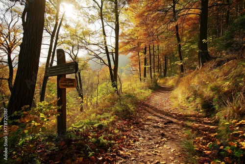 An autumn forest,, A scenic hiking trail winding through an autumn forest, AI generated