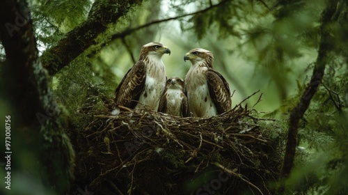 An eagle family perched in a tranquil forest nest, surrounded by dense greenery, representing the nurturing bond of wildlife.