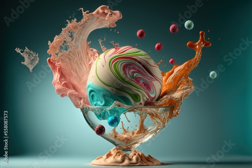 an ice cream sundae with colorful swirls and sprinkles in a glass bowl on a blue background with a splash of water and a splashing liquid from the top of the ice cream.
