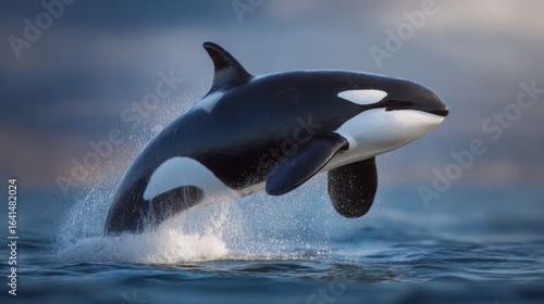 An orca breaches the water displaying its distinctive black and white markings against a soft blurred sky and calm ocean