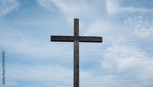 Ancient timber crucifix set against a backdrop of a cloudy azure sky