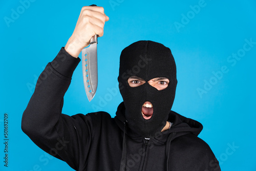 Angry assasin wearing black ski mask and holding and menacing with knife isolated on blue background. Delinquent looking at camera