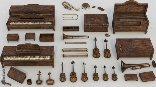 Antique Wooden Musical Instruments & Furniture Collection Studio Shot.