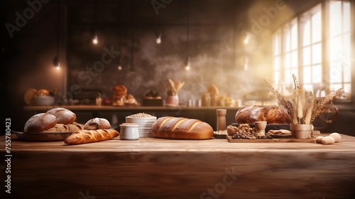 Appetizing bread on a sunny morning bakery counter, bakery shop