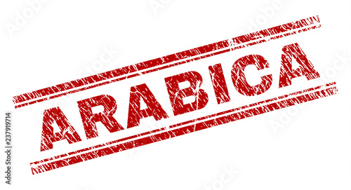 ARABICA seal print with grunge texture. Red vector rubber print of ARABICA text with dust texture. Text title is placed between double parallel lines.